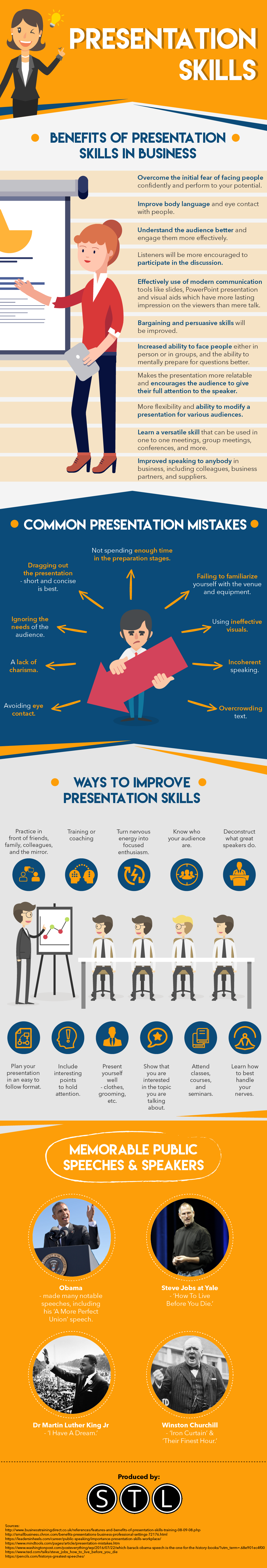 Finally, your speaking/presentation skills. There are many techniques for improvement, but the infographic below could be a huge help. Again, practice, practice, practice. Soon you’ll notice improvements!