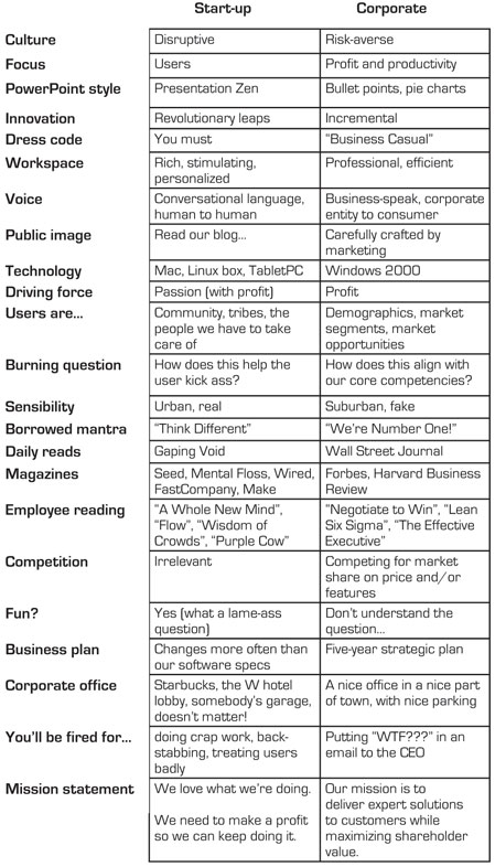 Kathy Sierra over at Creating Passionate Users created the chart below which illustrates the differences between the small start-ups we run, versus the large corporate powerhouses. An interesting point she made is that "When you evolve out of start-up mode and start worrying about being professional and dignified, you only lose capabilities. You don’t add anything…you only take away. Dignity is deadly."