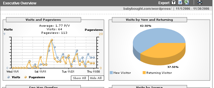 Traffic image will be up tonight as well, but analytics is reporting 669 visitors since 11/1/06.